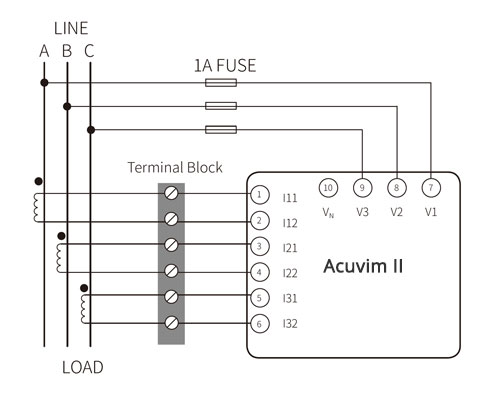 NOTE: If there is a neutral in the system you can jump the neutral from the voltage input to the ‘N’ terminal of the meters power supply, and use one of the voltage inputs to connect to ‘L’.